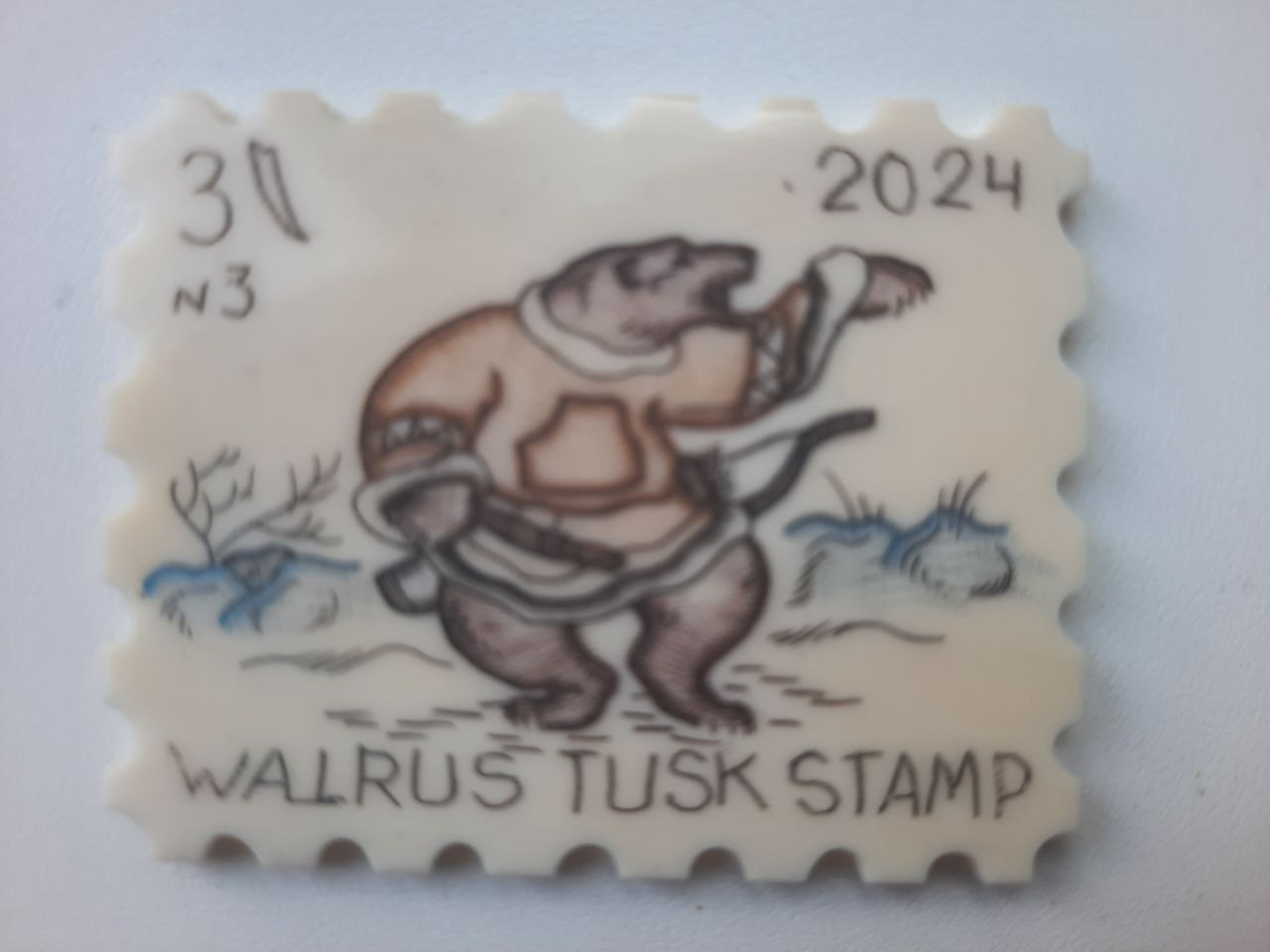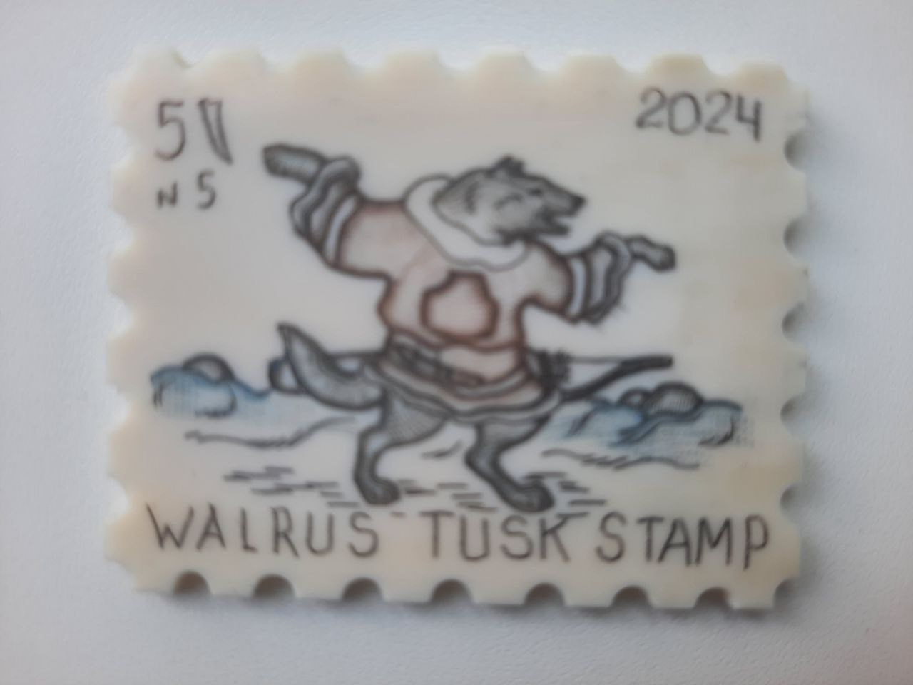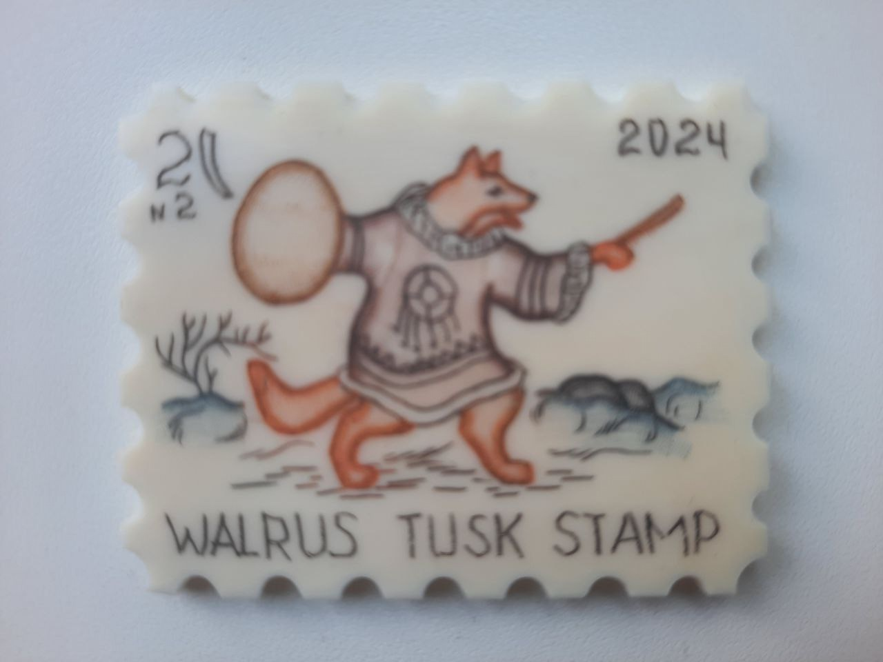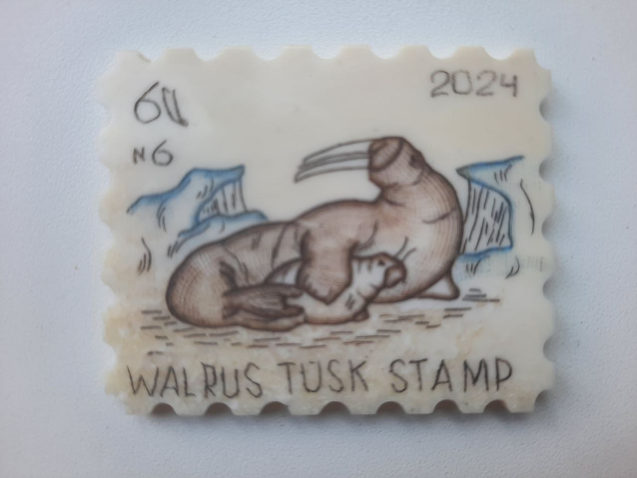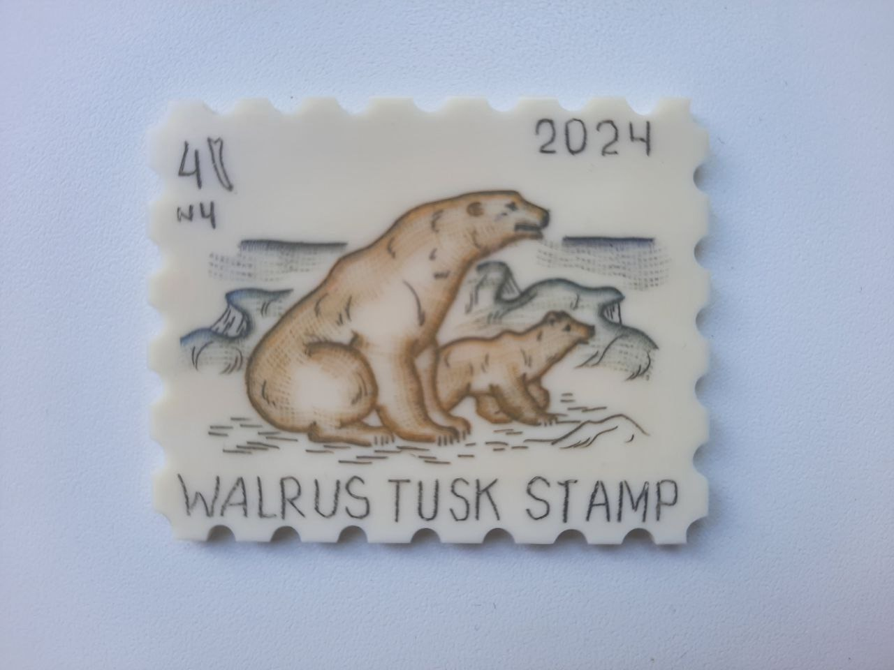 На марке из бивня моржа также нанесена надпись на английском языке WALRUS TUSK STAMP, что означает марка из бивня моржа. Марка с гравировкой имеет толщину - 3-4 мм., размер - 40 x 50 мм., имеет свой персональный номер начиная от №1 и т.д. и уникальный номинал – бивень моржа и год выпуска - 2024.