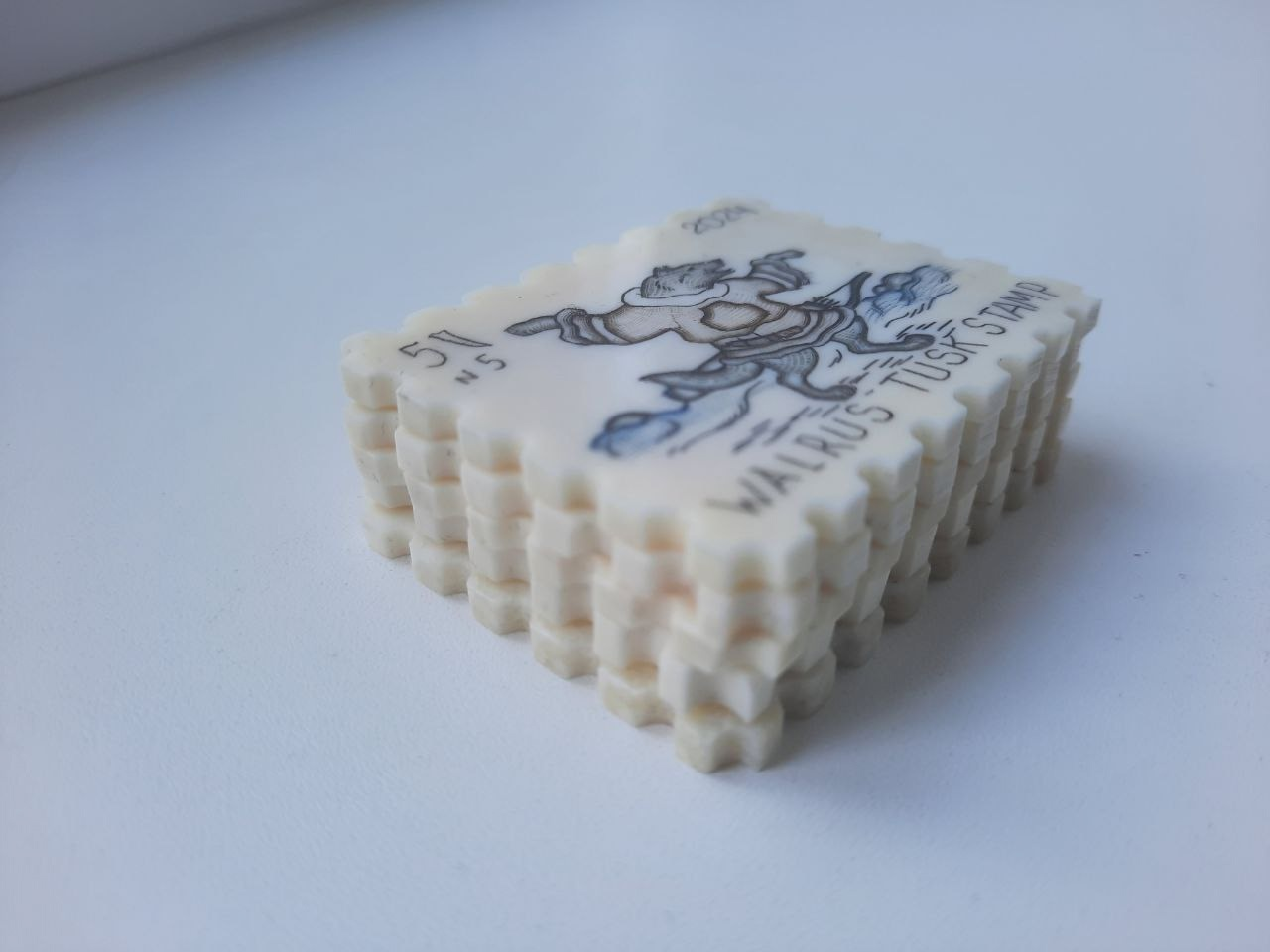 Подлинность марки-виньетки из бивня моржа (WALRUS TUSK STAMP) подтверждает сертификат подлинности эмитент марки из бивня моржа Всероссийский проект развития филатуризма «POSTVENTURE & Почтовое приключение» и АУ ЧАО «Центр развития народных промыслов «Уэленская косторезная мастерская».
